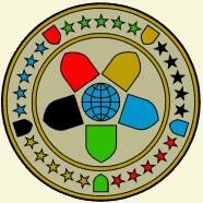symbolisiert mit den um den Globus gruppierten fünf Schilden die fünf Erdteile: